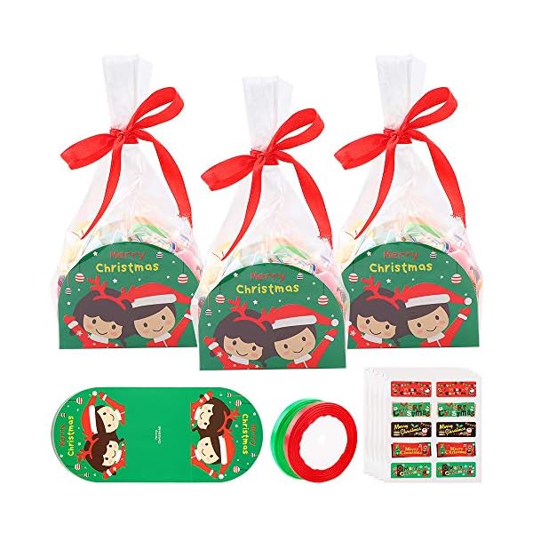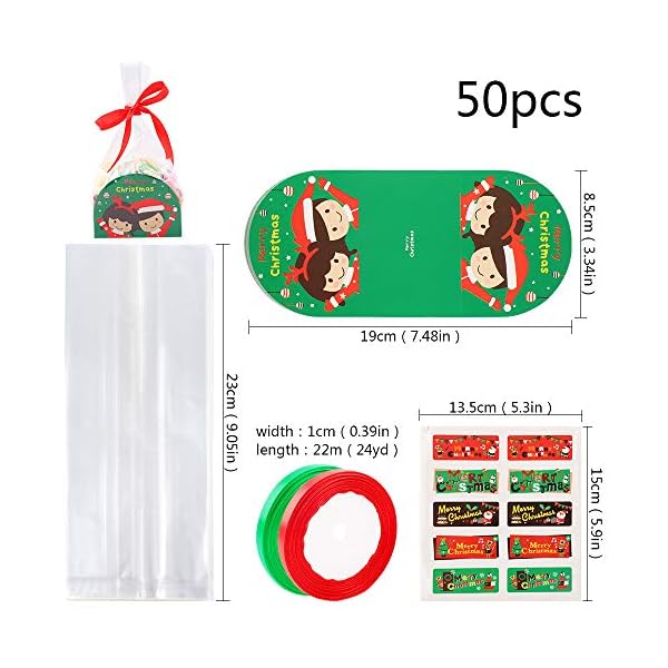 ➤ Paket beinhaltet – 50 Packungen Weihnachtskeksbeutel + 50 Stück Rote Frohe Weihnachtskarte + 1 Rolle 22 Meter rotes Weihnachtsband 10 mm + 1 Rolle 22 Meter grünes Weihnachtsband 10 mm + 50 x Weihnachtsaufkleber